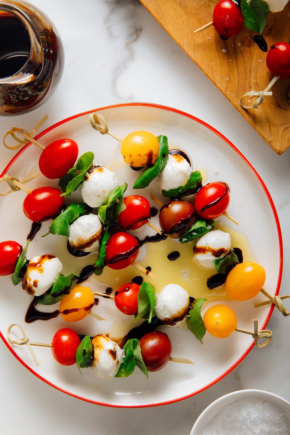 These caprese skewers are made with cherry tomatoes, basil and baby mozzarella balls with a balsamic vinegar and olive oil drizzle. They’re the perfect summertime party appetizer. Your guests will love this recipe! This recipe yields about 20 little skewers.