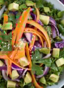 A beautiful raw kale salad tossed in a zippy red pepper and ginger dressing. Note that this recipe yields enough dressing for four medium-sized salads. The salad ingredients yield one medium-sized salad, so multiply by up to four if you’re feeding friends or family.